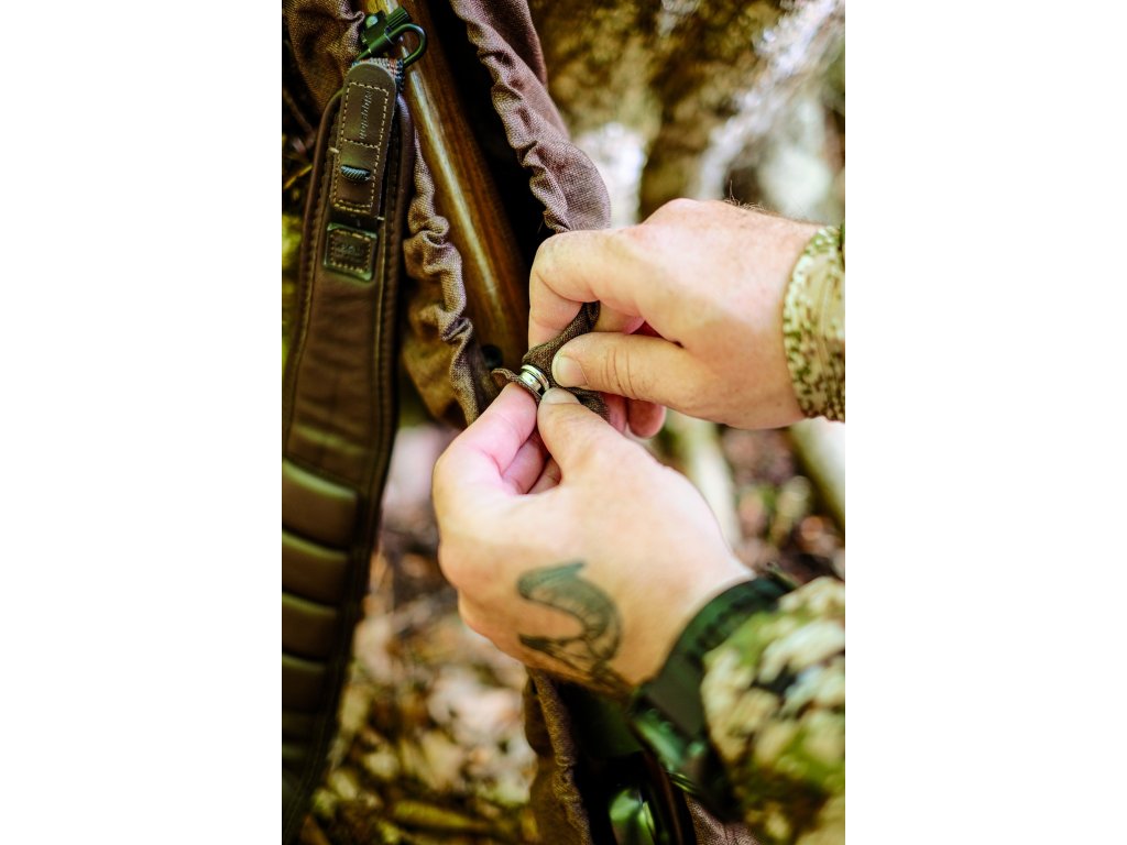 Elastic bands sewn along the sides ensure a snug fit once the rifle is inserted, reducing shifting and noise while walking. Two side openings allow for easy handling with a strap or direct carry, even with the cover on. A single, secure snap button keeps the cover in place and allows for quick removal when the firearm needs to be ready for use.
